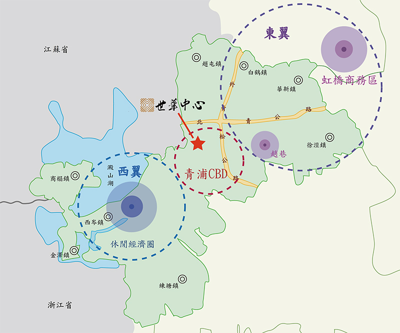 世華中心位於上海西郊青浦區內,青浦共分為三個區域,分別為城區、東翼與西翼。世華中心正位於青浦核心區域CBD,位於崧澤大道與外青松公路之交界,往西有上海最大的淡水湖-澱山湖,擁有豐富的休閒旅遊、生態居住等資源,往東則是依託虹橋商務區,擁有全國最大的國家會展中心,重點開發會展產業、總部經濟與文化創意產業等區域優勢。