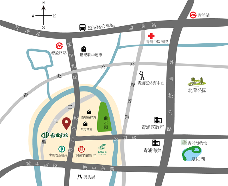 青浦賓館坐落於青浦區市中心的繁華商業地段,緊鄰百聯僑梓灣商業中心、美食廣場以及具有200多年歷史的上海5大園林之一的曲水園及古蹟城隍廟。距離上海虹橋交通樞紐以及50萬平米的國家會展中心僅需25分鐘車程、浦東國際機場約1小時車程、青浦工業園區5分鐘車程,交通便捷,週邊生活機能完備,是青浦區唯一一座花園式商務型高星級涉外賓館。