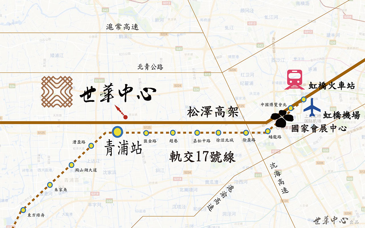 從世華中心開車僅需十五分鐘(崧澤高架) ,或搭乘軌交17號線僅需八站即可連接虹橋交通樞紐以及五十萬平方米的國家會展中心,交通四通八達,透過虹橋樞紐的陸、海、空交通,即可快速與中國及亞洲各大重要城市接軌,形成便捷而快速的一日商務經濟圈。